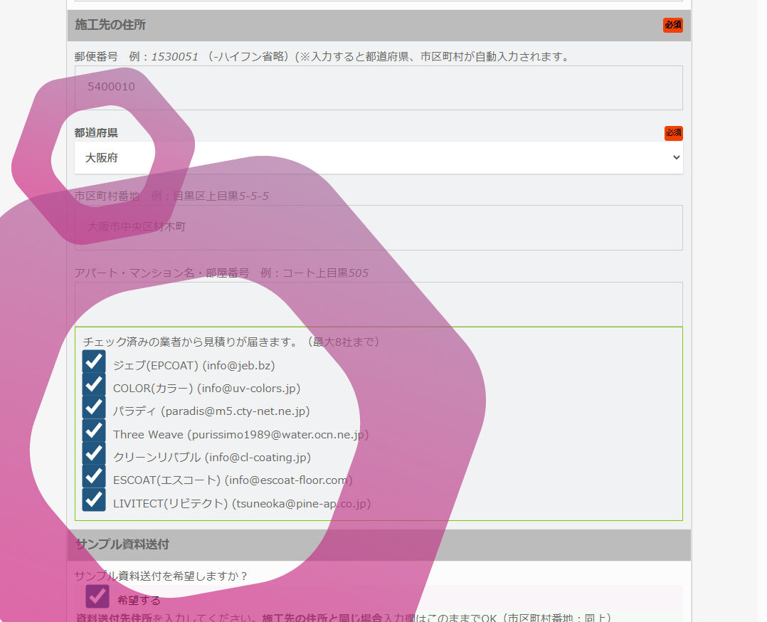 一括見積りフォームが送信されるとチェック済みのフロアコーティング施工会社へ一括見積り依頼のメールが瞬時に一斉送信されます。施工会社の営業時間にも左右されますが早いところで最短15分で見積りが届きます。施工会社の営業時間内だとレスポンスも早い傾向です。サンプル資料の場合は郵送になりますので数日時間を要します。
